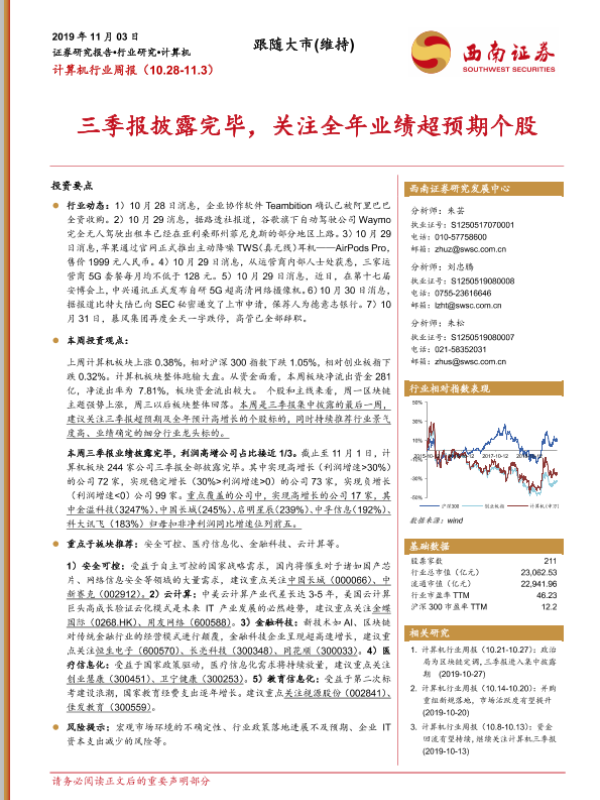 【西南证券】【20191103】计算机行业周报:三季报披露完毕,关注全年业绩超预期个股-18页