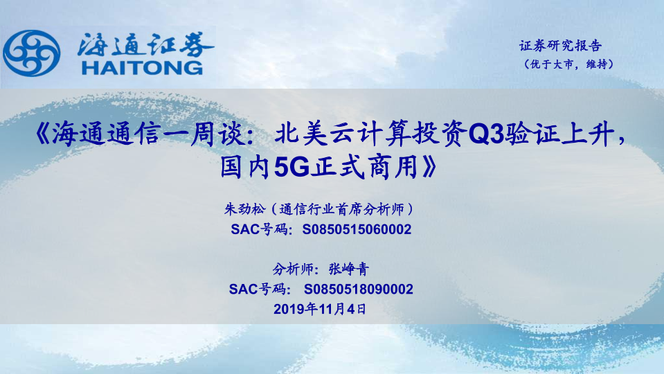 【海通证券】【20191104】海通通信一周谈:北美云计算投资Q3验证上升,国内5G正式商用-11页