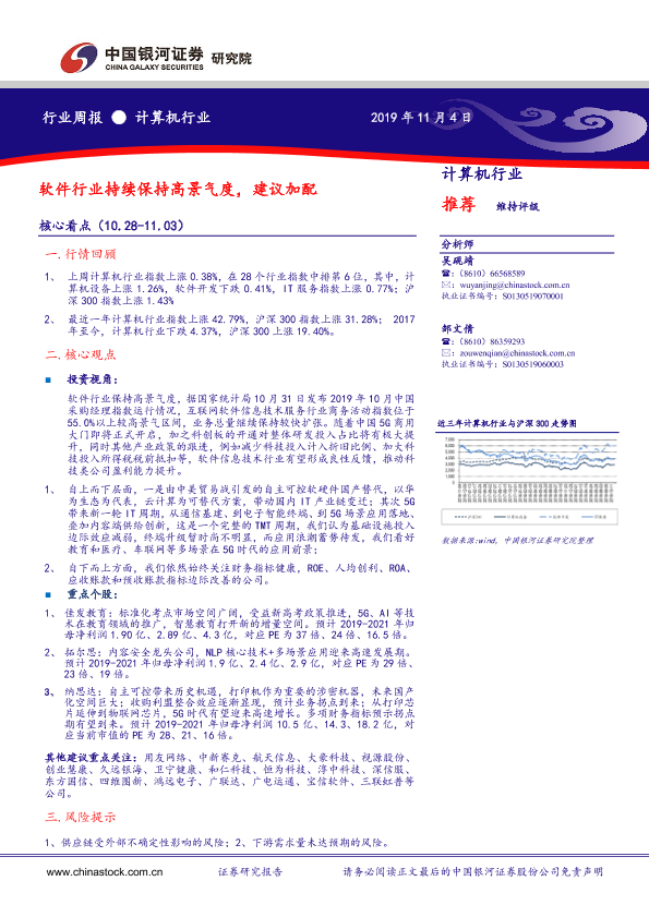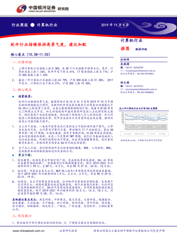 【银河证券】【20191104】计算机行业周报:软件行业持续保持高景气度 建议加配-19页