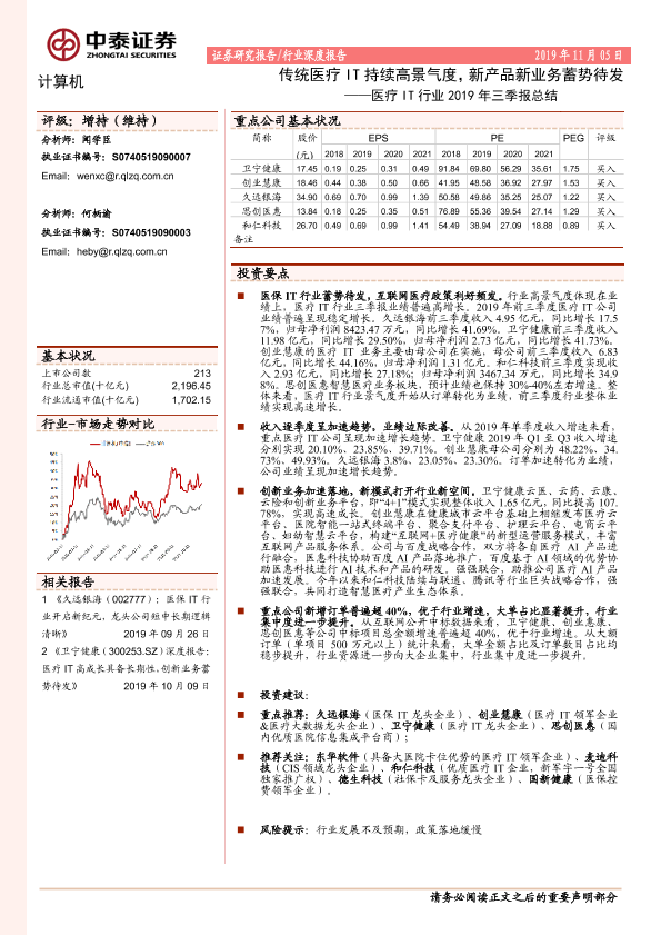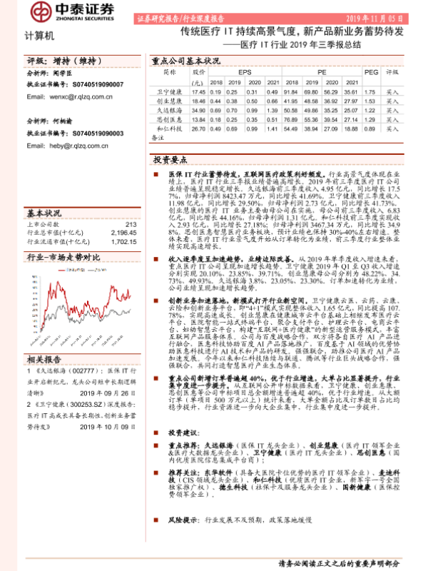【中泰证券】【20191105】医疗IT行业2019年三季报总结:传统医疗IT持续高景气度,新产品新业务蓄势待发-15页