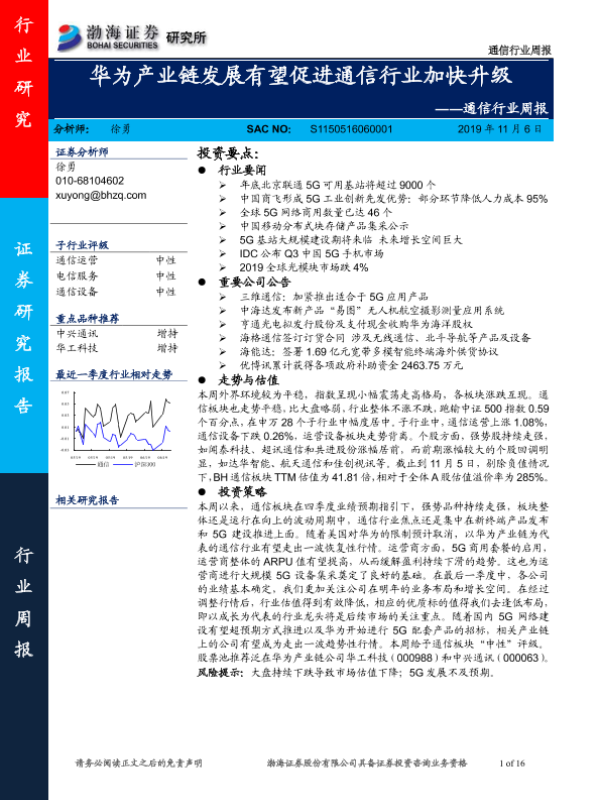 【渤海证券】【20191106】通信行业周报:华为产业链发展有望促进通信行业加快升级-16页