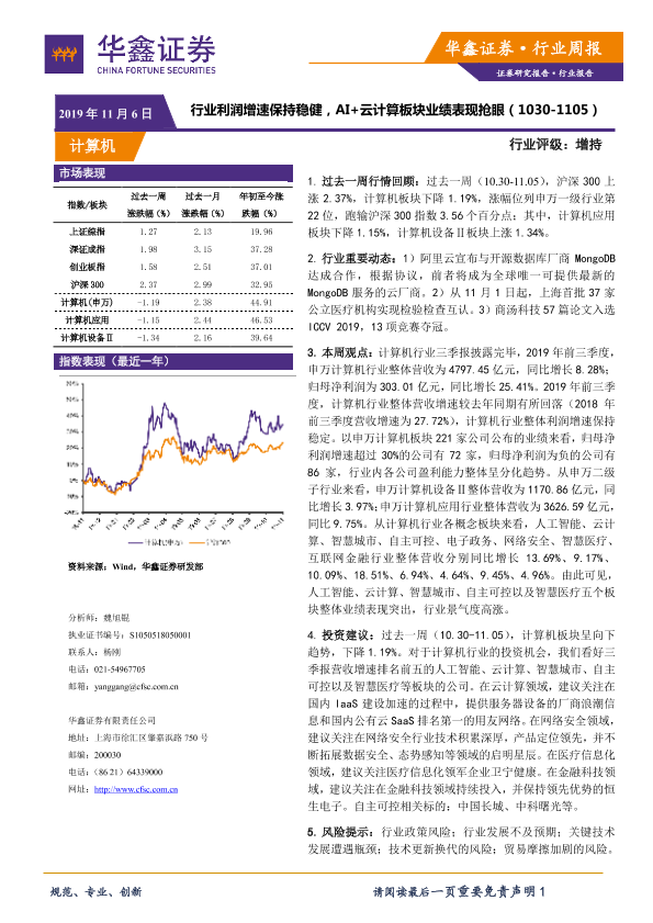 【华鑫证券】【20191106】计算机行业周报:行业利润增速保持稳健,AI+云计算板块业绩表现抢眼-14页