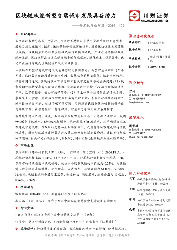 【川财证券】【20191110】计算机行业周报:区块链赋能新型智慧城市发展具备潜力-10页