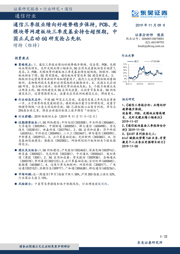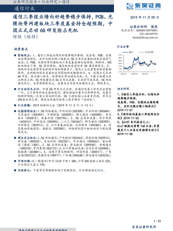 【东吴证券】【20191109】通信三季报业绩向好趋势稳步保持,PCB、光模块等网建板块三季度基金持仓超预期,中国正式启动6G研发抢占先机-22页