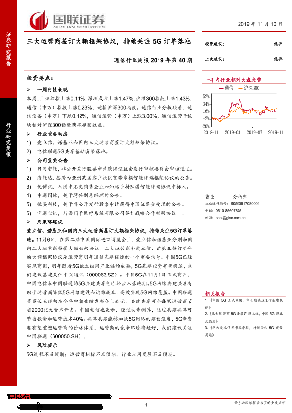 【国联证券】【20191110】通信行业周报2019年第40期:三大运营商签订大额框架协议,持续关注5G订单落地-9页