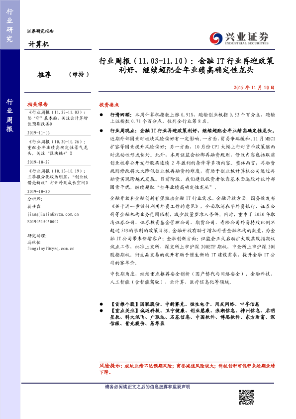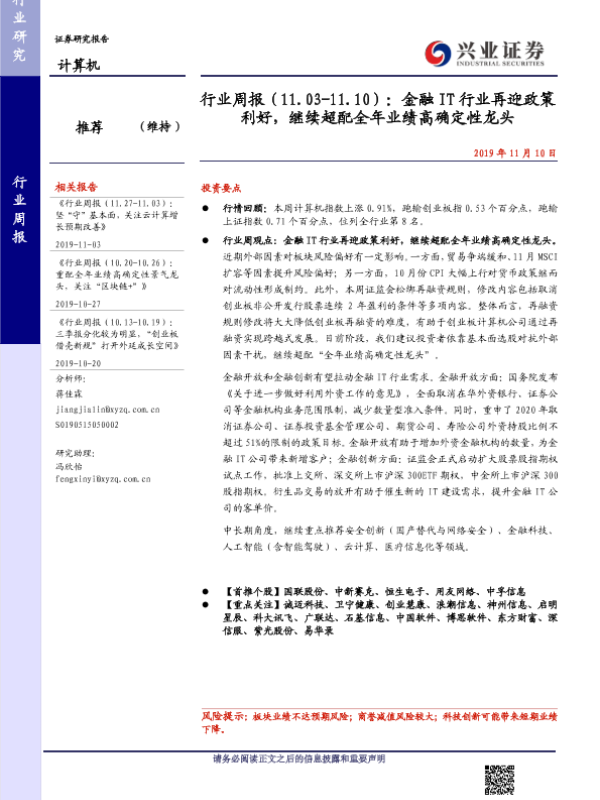 【兴业证券】【20191110】行业周报(11.03-11.10):金融 IT行业再迎政策 利好,继续超配全年业绩高确定性龙头-12页