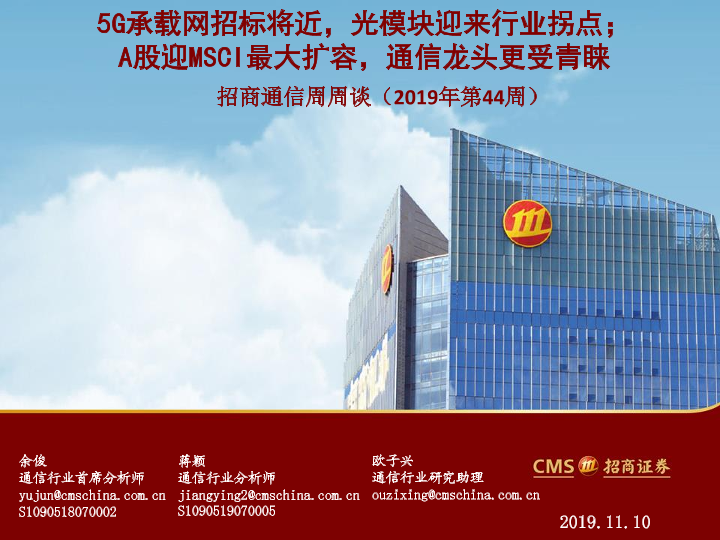 【海通证券】【20191110】招商通信周周谈(2019年第44周):5G承载网招标将近,光模块迎来行业拐点;A股迎MSCI最大扩容,通信龙头更受青睐-37页