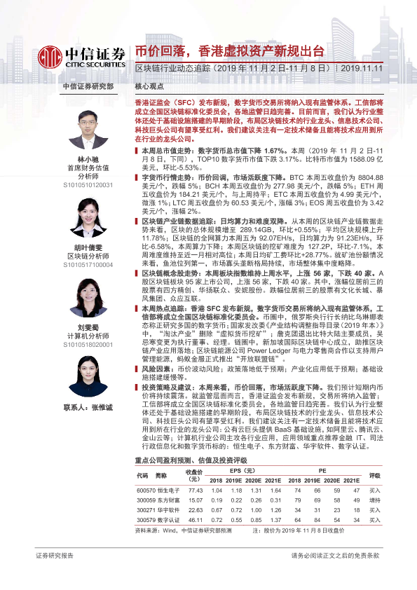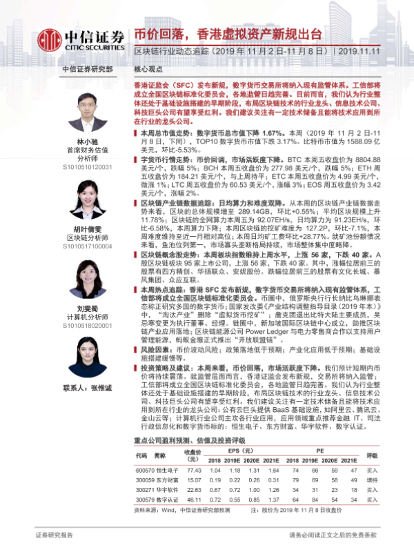 【中信证券】【20191111】区块链行业动态追踪:币价回落,香港虚拟资产新规出台-19页