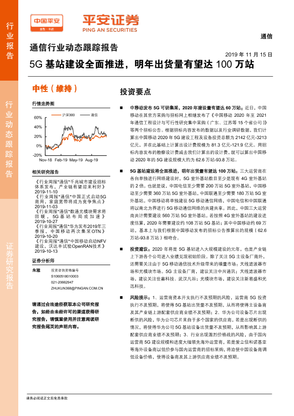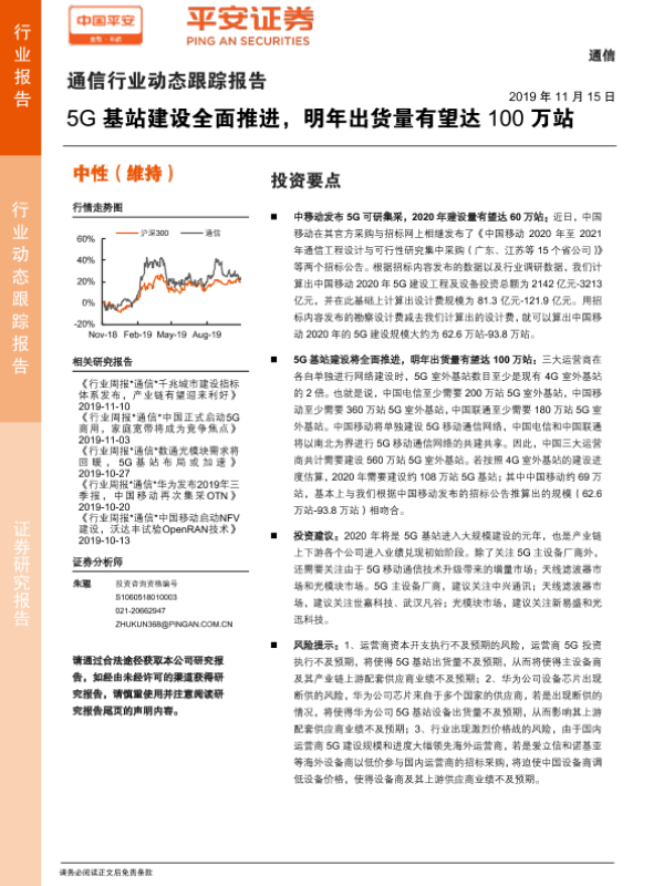 【平安证券】【20191115】通信行业动态跟踪报告:5G基站建设全面推进,明年出货量有望达100万站-6页