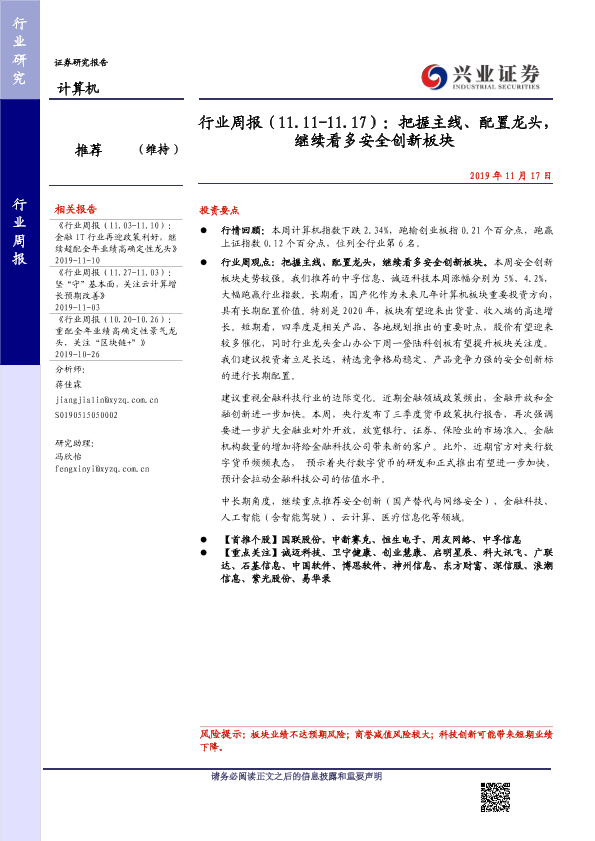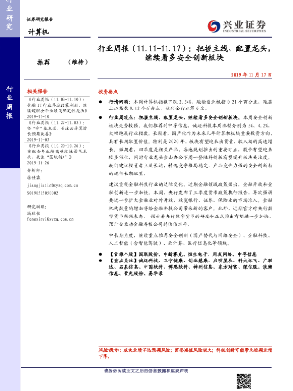 【兴业证券】【20191117】行业周报(11.11-11.17):把握主线、配置龙头,继续看多安全创新板块-13页