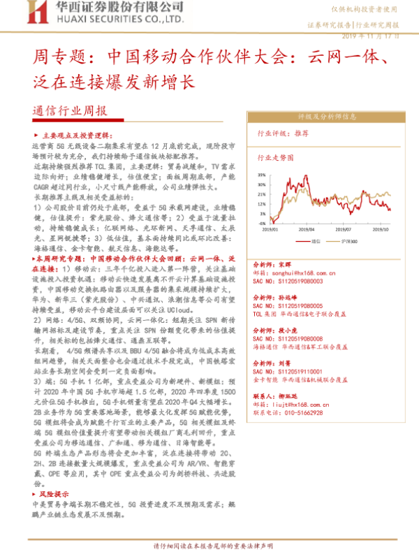 【华西证券】【20191117】20191117-华西证券-通信行业周报:周专题:中国移动合作伙伴大会:云网一体、泛在连接爆发新增长-17页