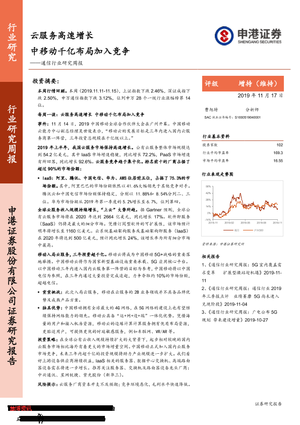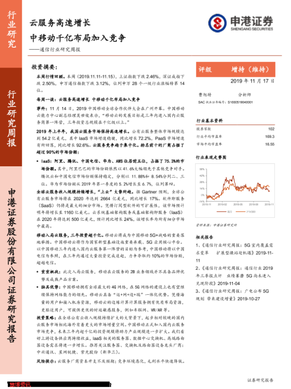 【申港证券】【20191117】通信行业研究周报:云服务高速增长 中移动千亿布局加入竞争-14页