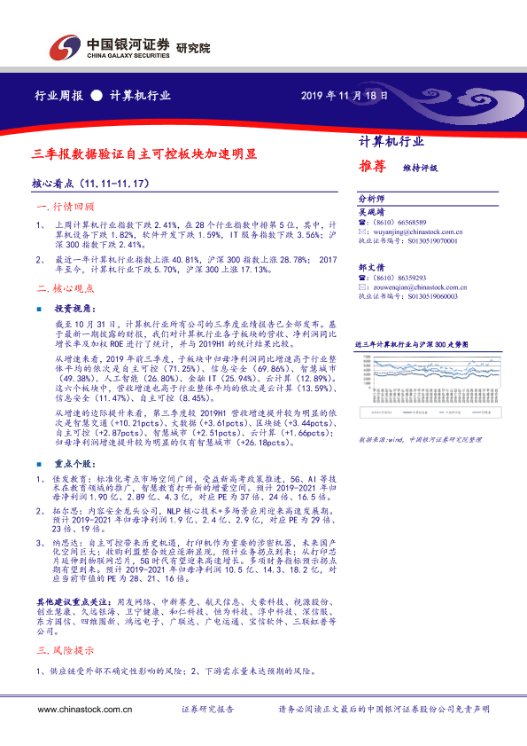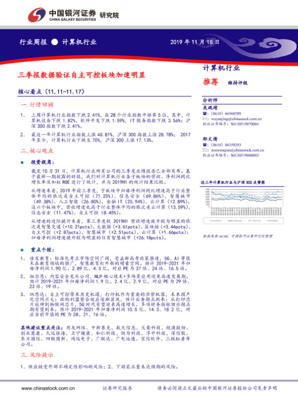 【银河证券】【20191118】计算机行业周报:三季报数据验证自主可控板块加速明显-19页