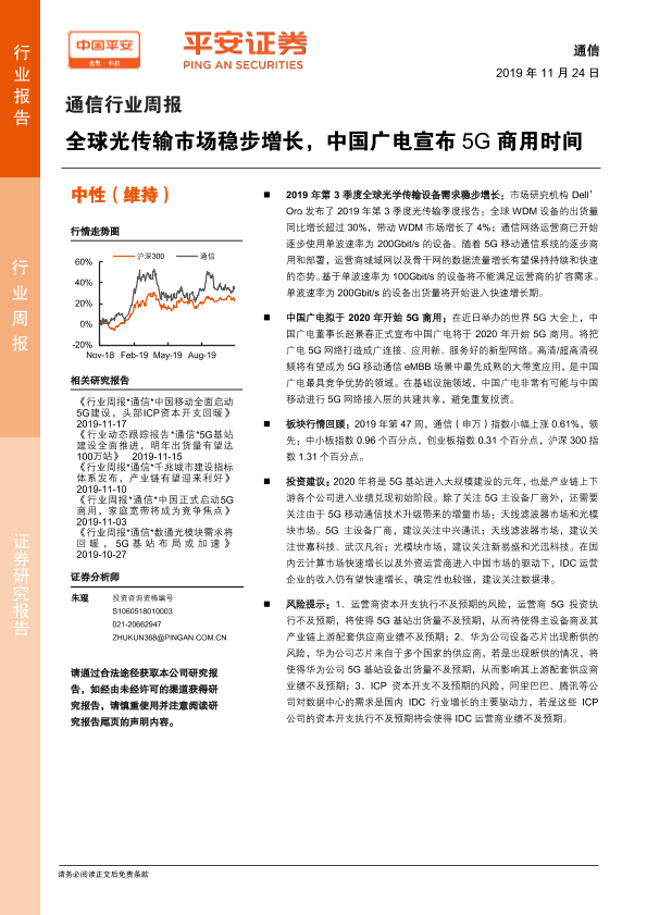 【平安证券】【20191124】通信行业周报:全球光传输市场稳步增长,中国广电宣布5G商用时间-5页