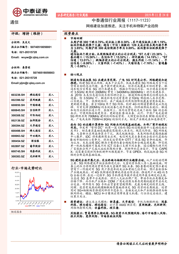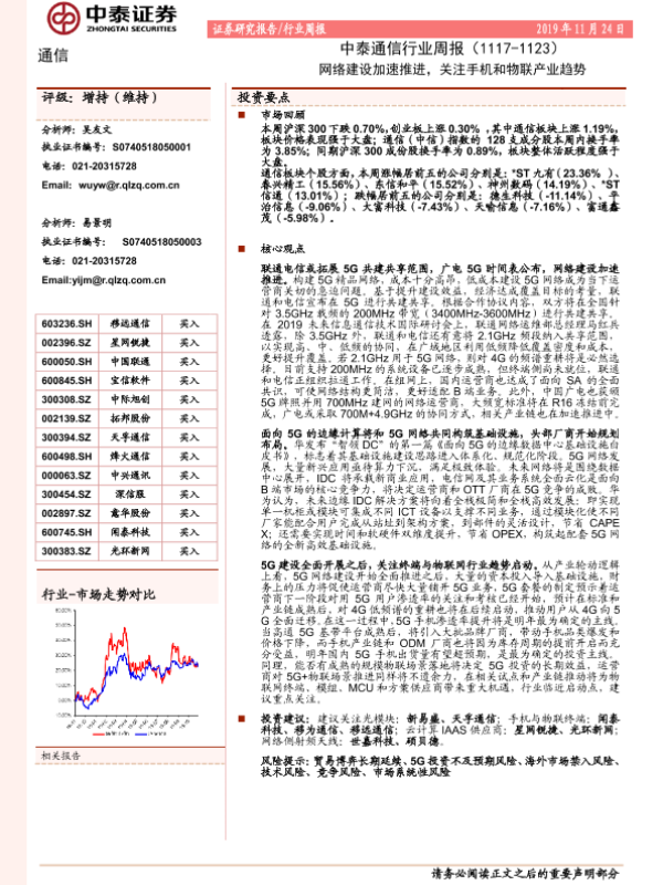 【中泰证券】【20191124】中泰通信行业周报:网络建设加速推进,关注手机和物联产业趋势-14页