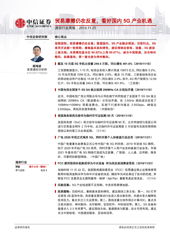 【中信证券】【20191125】通信行业周报:贸易摩擦仍在反复,看好国内5G产业机遇-10页