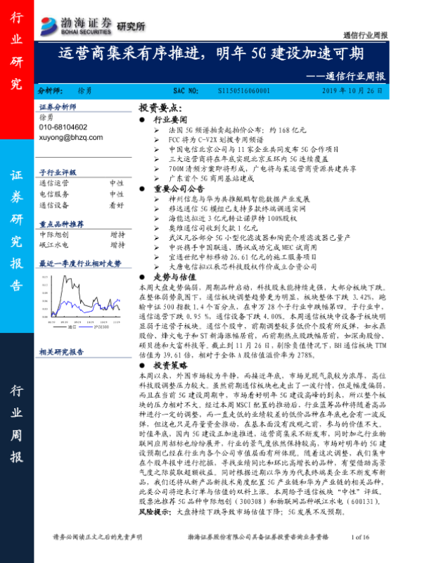 【渤海证券】【20191126】通信行业周报:运营商集采有序推进,明年5G建设加速可期-16页
