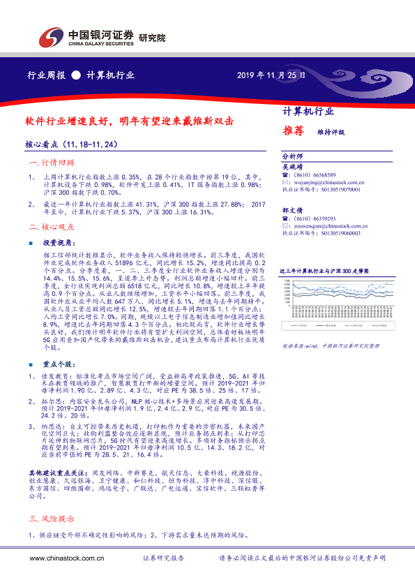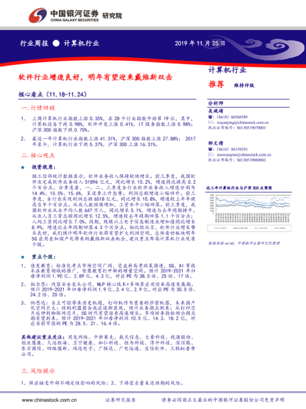【银河证券】【20191125】计算机行业周报:软件行业增速良好,明年有望迎来戴维斯双击-19页