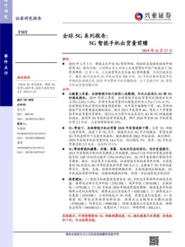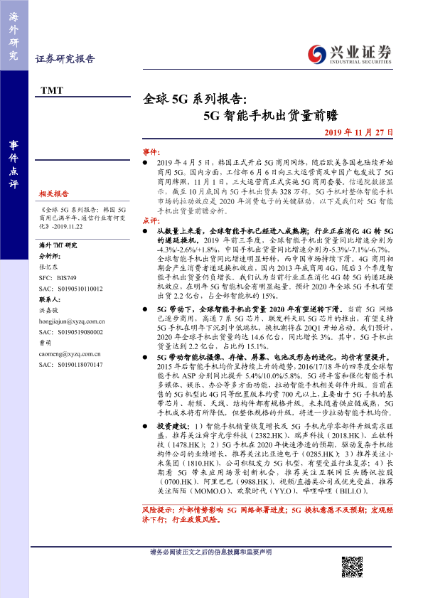 【兴业证券】【20191127】全球5G系列报告:5G智能手机出货量前瞻-8页
