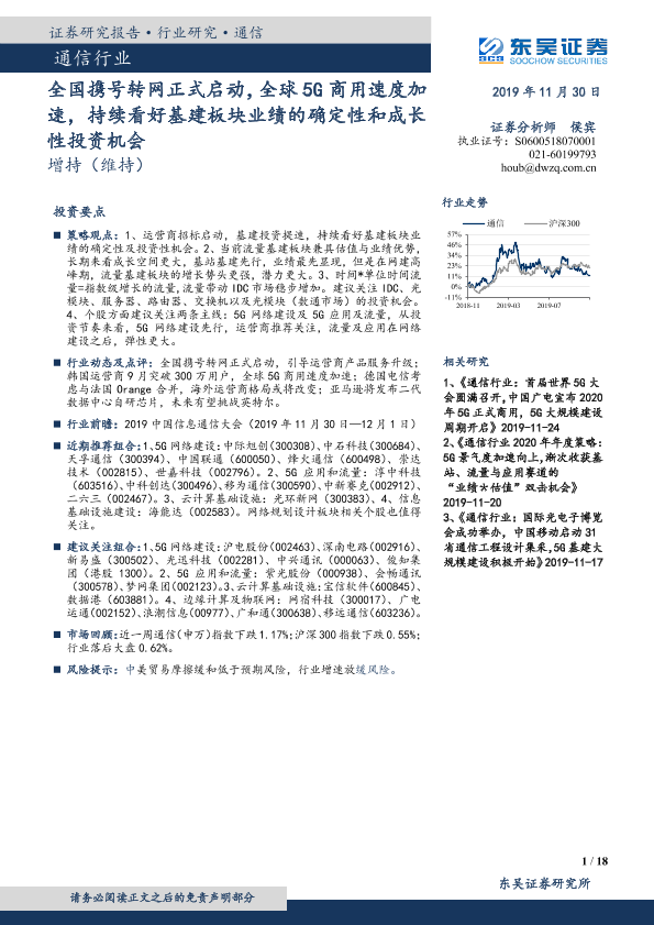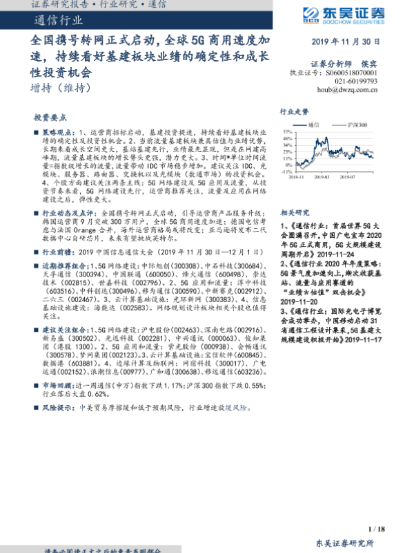 【东吴证券】【20191130】全国携号转网正式启动,全球5G商用速度加速,持续看好基建板块业绩的确定性和成长性投资机会-18页