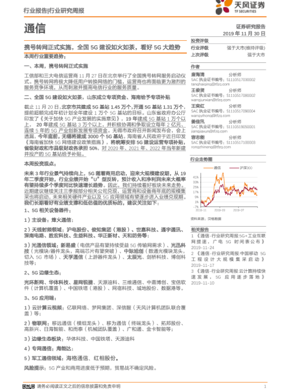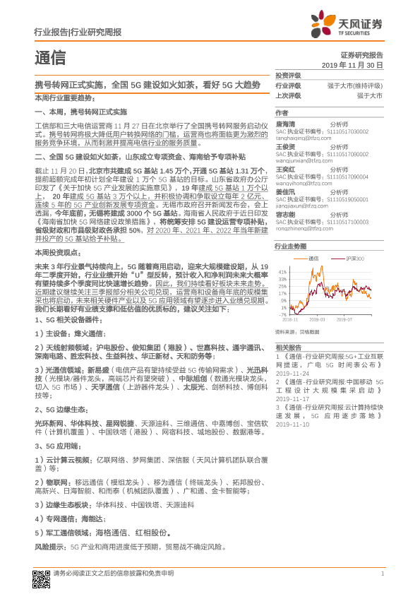 【天风证券】【20191130】通信行业研究周报:携号转网正式实施,全国5G建设如火如荼,看好5G大趋势-18页