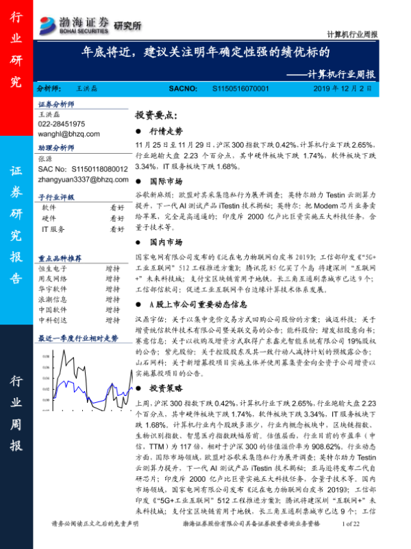 【渤海证券】【20191202】20191202-渤海证券-计算机行业周报:年底将近,建议关注明年确定性强的绩优标的-22页