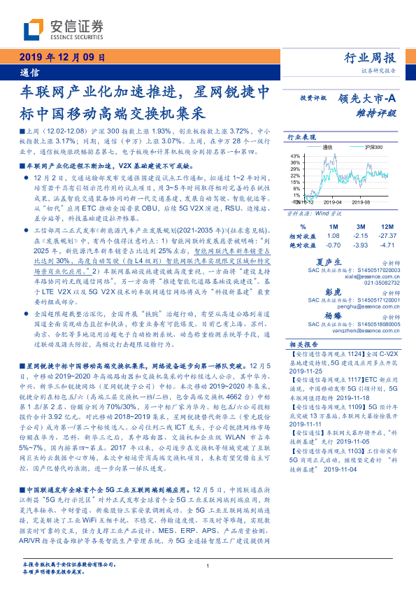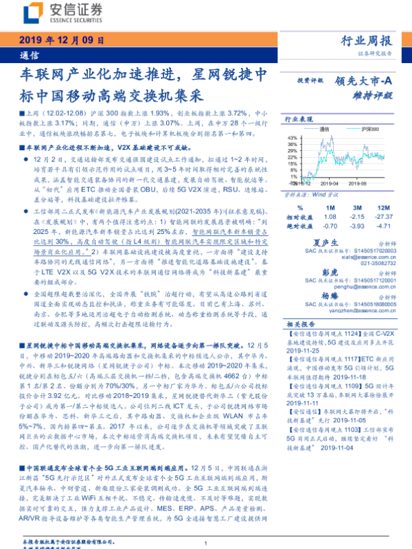 【安信证券】【20191209】20191209-安信证券-通信行业周报:车联网产业化加速推进,星网锐捷中标中国移动高端交换机集采-13页