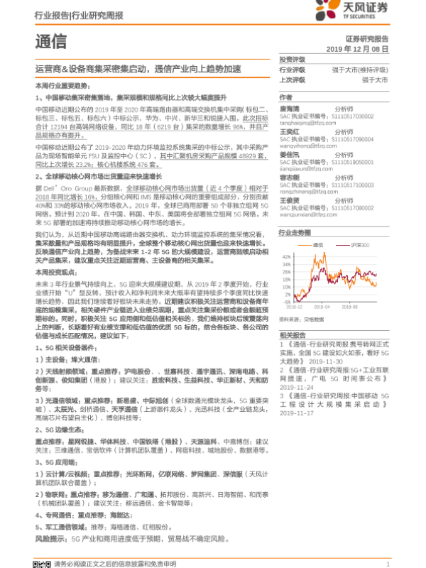【天风证券】【20191208】通信行业研究周报:运营商&设备商集采密集启动,通信产业向上趋势加速-18页