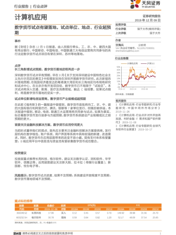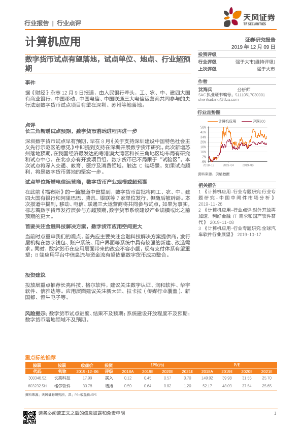 【天风证券】【20191209】计算机应用行业点评:数字货币试点有望落地,试点单位、地点、行业超预期-2页