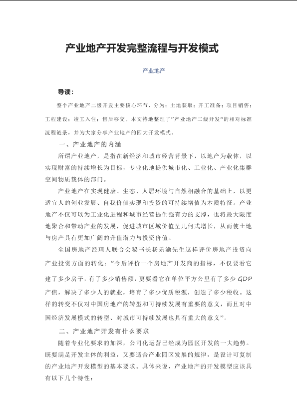 产业地产 城市经营 开发模式 开发流程 房地产投资
