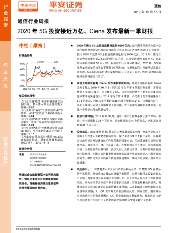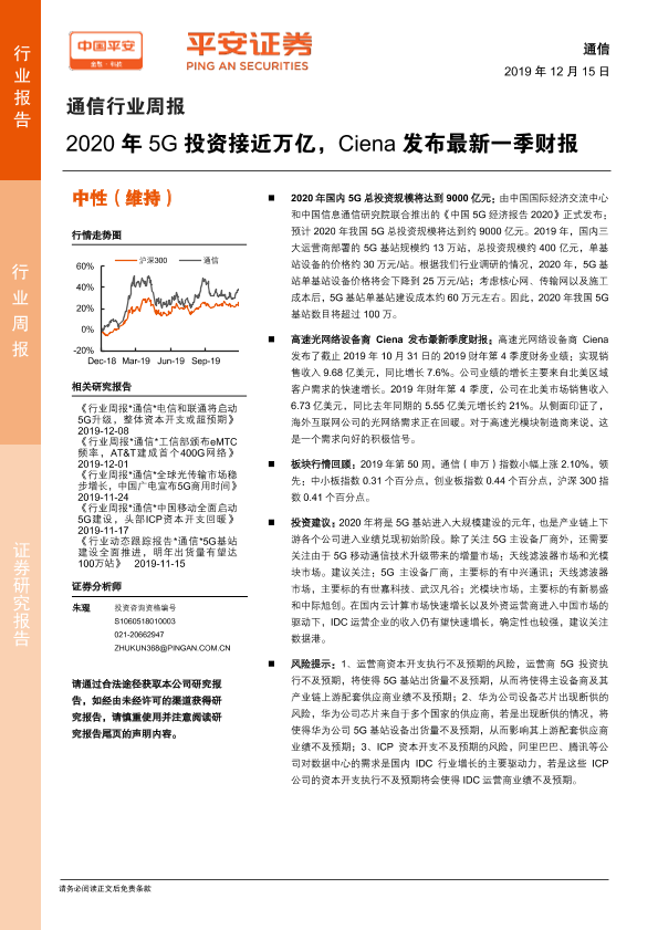 【平安证券】【20191215】20191215-平安证券-通信行业周报:2020年5G投资接近万亿,Ciena发布最新一季财报-5页