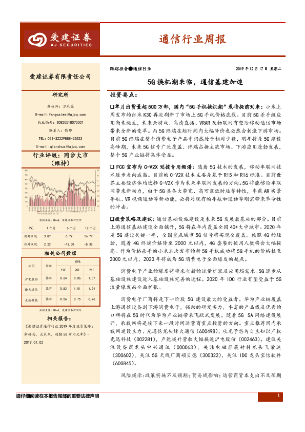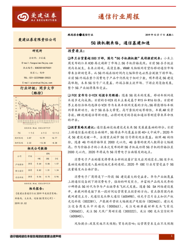 【爱建证券】【20191217】通信行业周报:5G换机潮来临,通信基建加速-12页