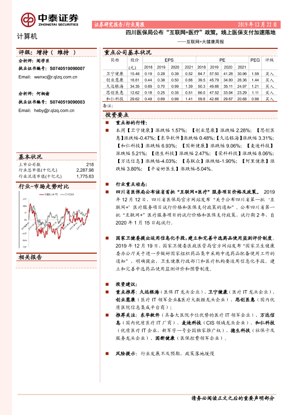 【中泰证券】【20191222】互联网+大健康周报:四川医保局公布“互联网+医疗”政策,线上医保支付加速落地-12页