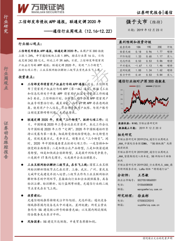 【万联证券】【20191223】通信行业周观点:工信部发布侵权APP通报,联通定调2020年-12页