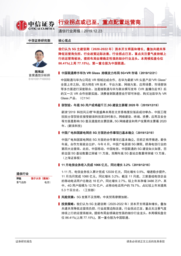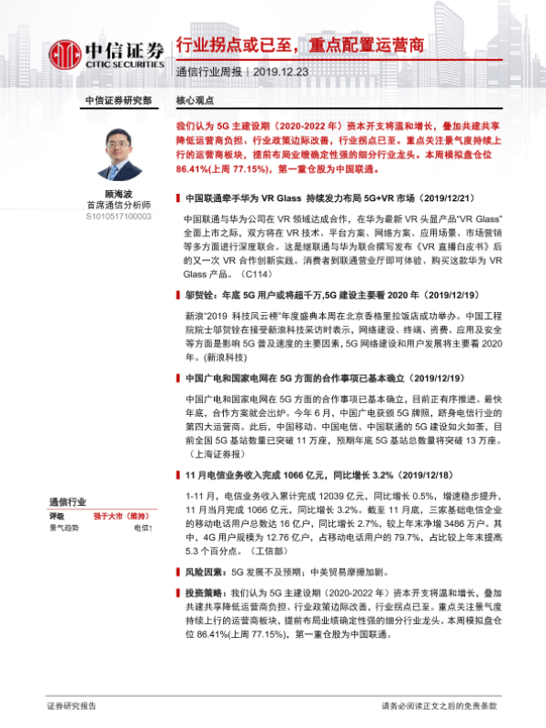 【中信证券】【20191223】通信行业周报:行业拐点或已至,重点配置运营商-8页