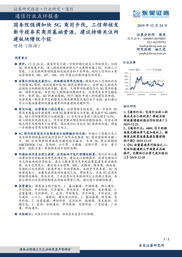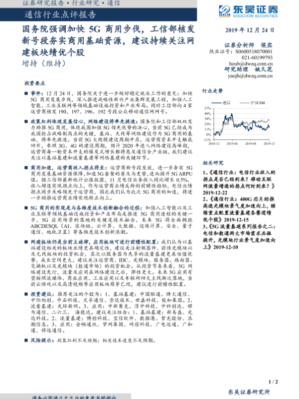 【东吴证券】【20191224】通信行业点评报告:国务院强调加快5G商用步伐,工信部核发新号段夯实商用基础资源,建议持续关注网建板块绩优个股-2页