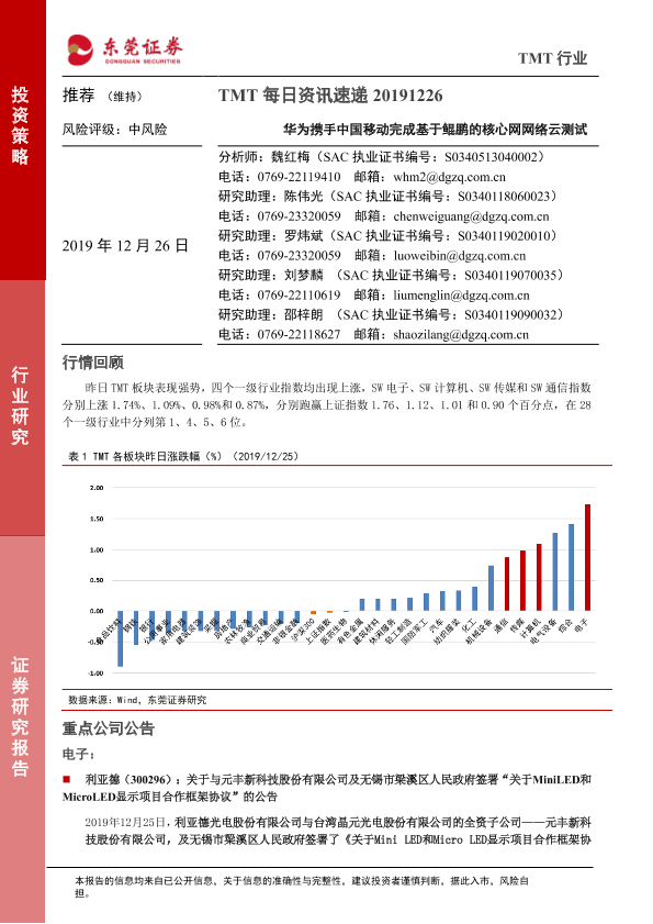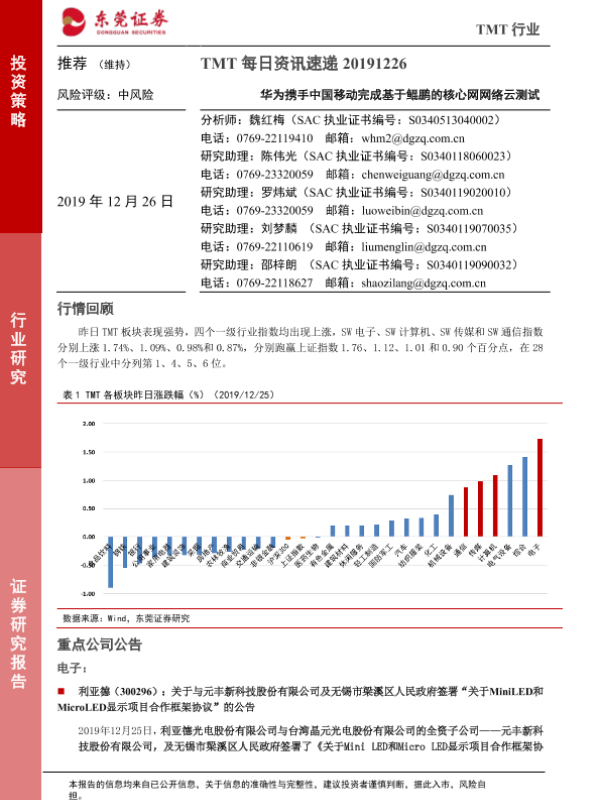 【东莞证券】【20191226】TMT每日资讯速递:华为携手中国移动完成基于鲲鹏的核心网网络云测试-5页