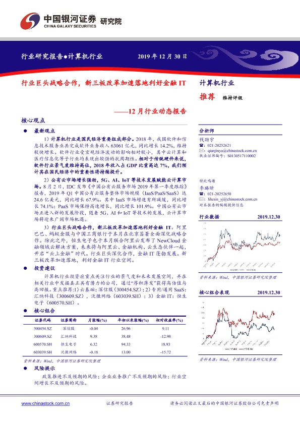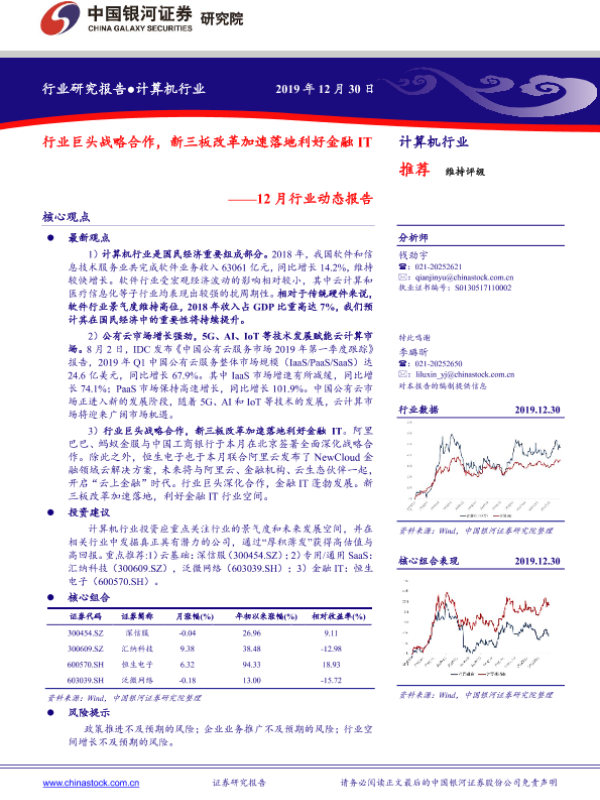 【银河证券】【20191230】计算机行业12月行业动态报告:行业巨头战略合作,新三板改革加速落地利好金融IT-29页