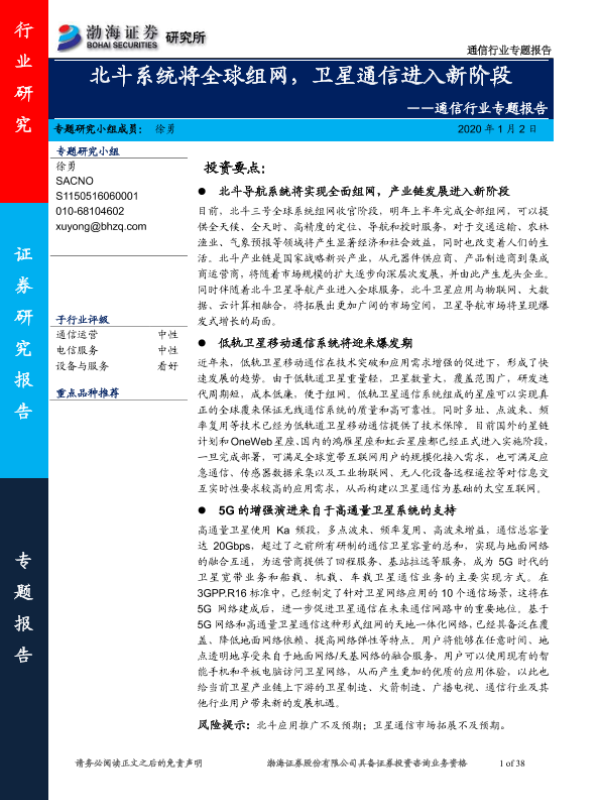 【渤海证券】【20200102】通信行业专题报告:北斗系统将全球组网,卫星通信进入新阶段-38页
