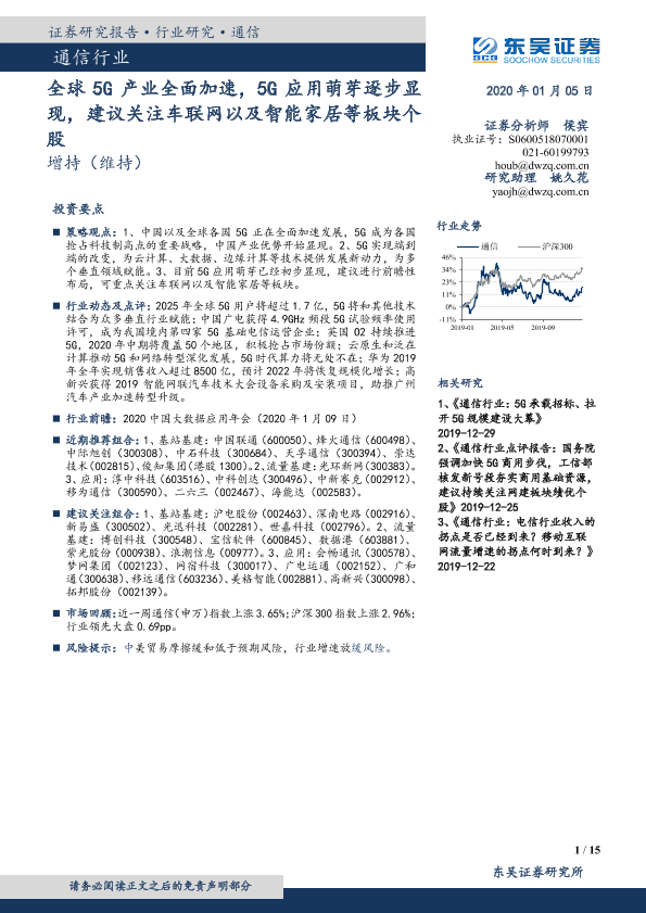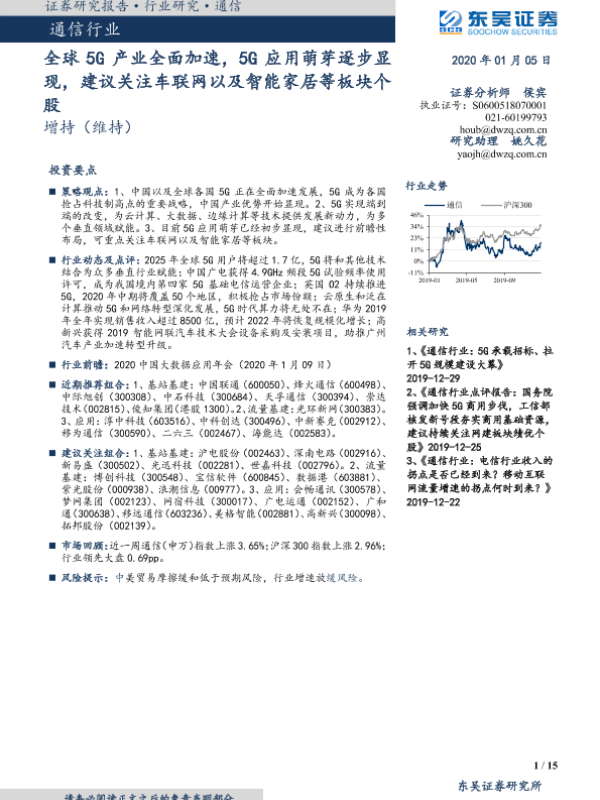 【东吴证券】【20200105】20200105-东吴证券-通信行业行业跟踪周报:全球5G产业全面加速,5G应用萌芽逐步显现,建议关注车联网以及智能家居等板块个股-15页