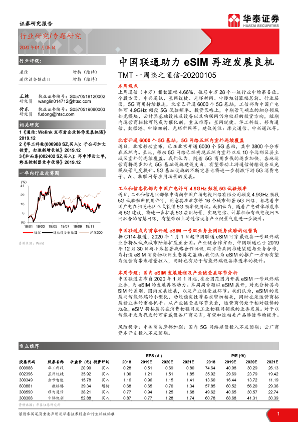 【华泰证券】【20200105】20200105-华泰证券-TMT一周谈之通信:中国联通助力eSIM再迎发展良机-12页