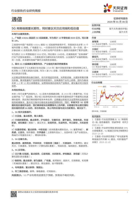 【天风证券】【20200105】通信行业研究周报:5G网络端侧重长期性,同时建议关注应用端和低估值-14页