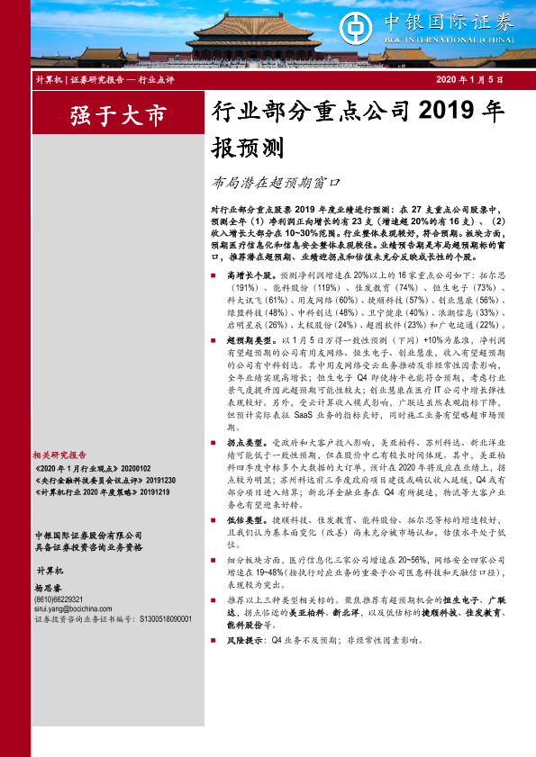 【中银证券】【20200105】计算机:行业部分重点公司2019年报预测:布局潜在超预期窗口-5页