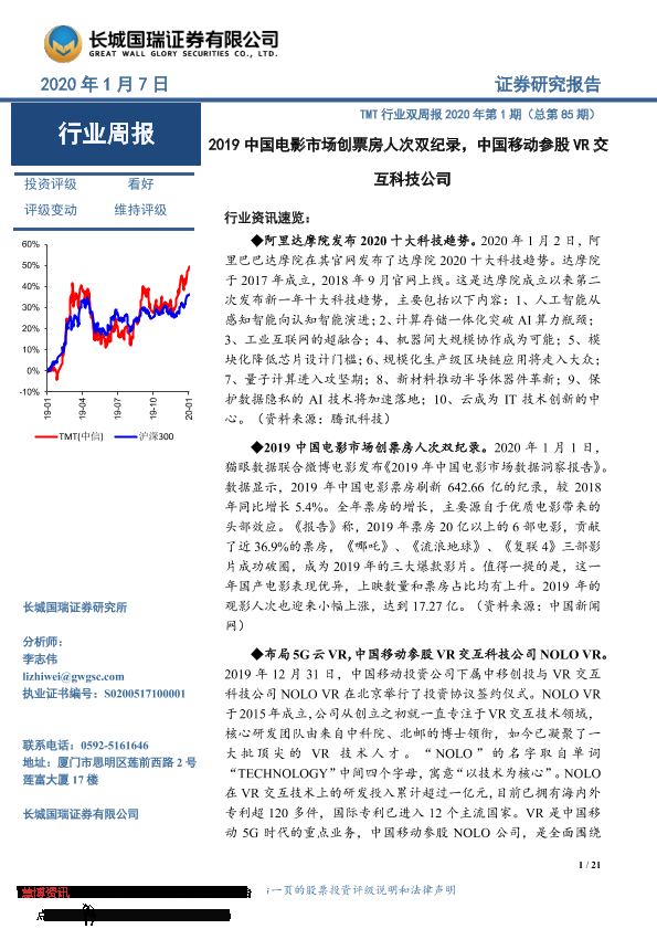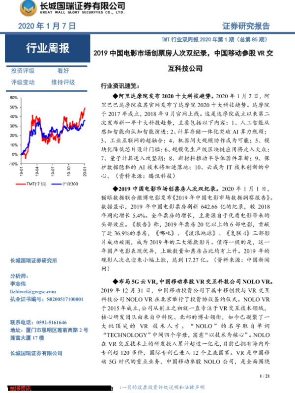 【长城国瑞证券】【20200107】TMT行业双周报2020年第1期(总第85期):2019中国电影市场创票房人次双纪录,中国移动参股VR交互科技公司-21页