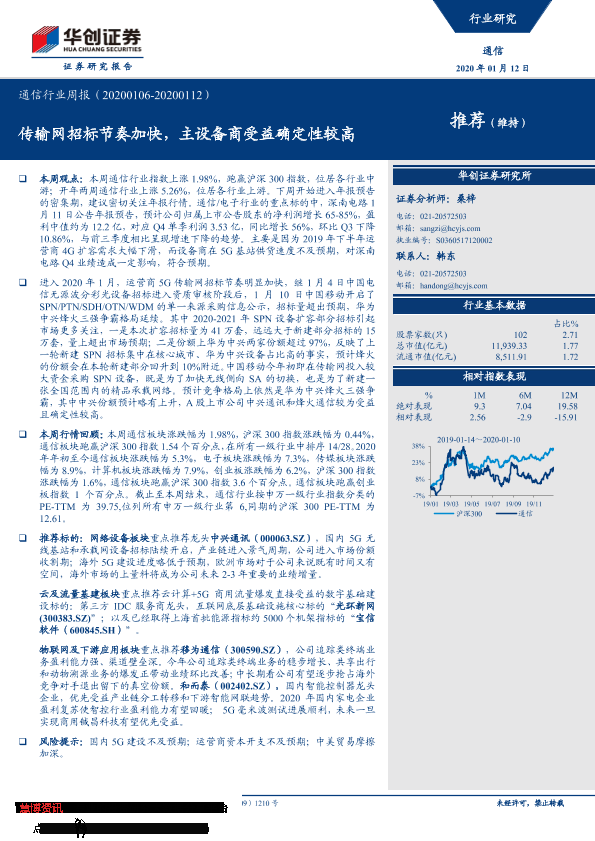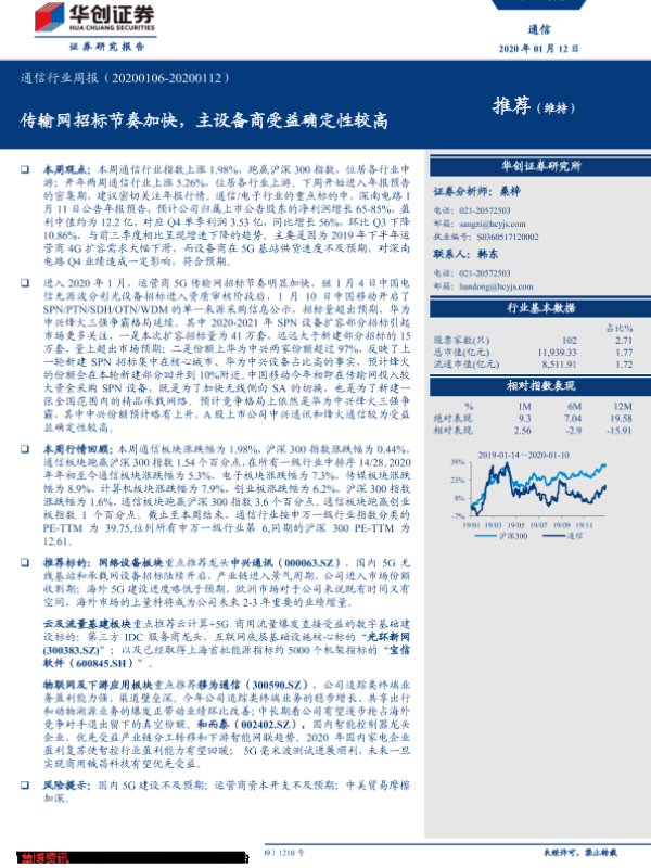 【华创证券】【20200112】20200112-华创证券-通信行业周报:传输网招标节奏加快,主设备商受益确定性较高-17页