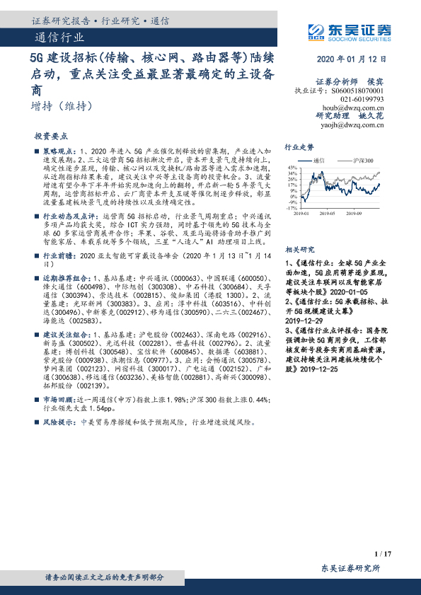 【东吴证券】【20200112】通信行业跟踪周报:5G建设招标(传输、核心网、路由器等)陆续启动,重点关注受益最显著最确定的主设备商-17页