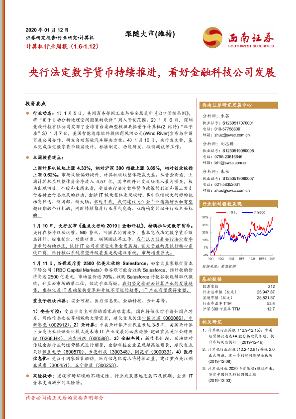 【西南证券】【20200112】计算机行业周报:央行法定数字货币持续推进,看好金融科技公司发展-15页