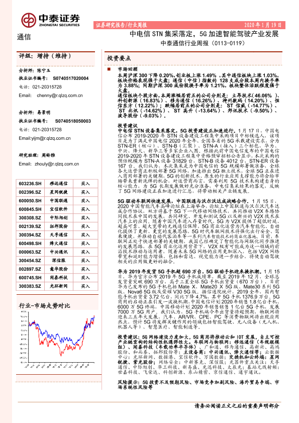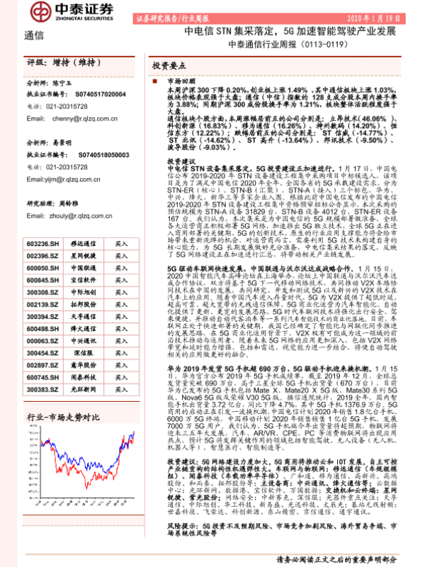 【中泰证券】【20200119】中泰通信行业周报:中电信STN集采落定,5G加速智能驾驶产业发展-10页