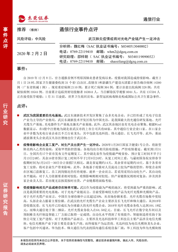 【东莞证券】【20200202】通信行业事件点评:新冠肺炎疫情或将对光电产业链产生一定冲击-3页