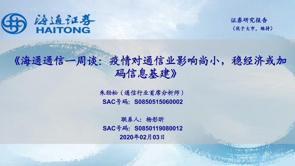 【海通证券】【20200203】海通通信一周谈:疫情对通信业影响尚小,稳经济或加码信息基建-10页